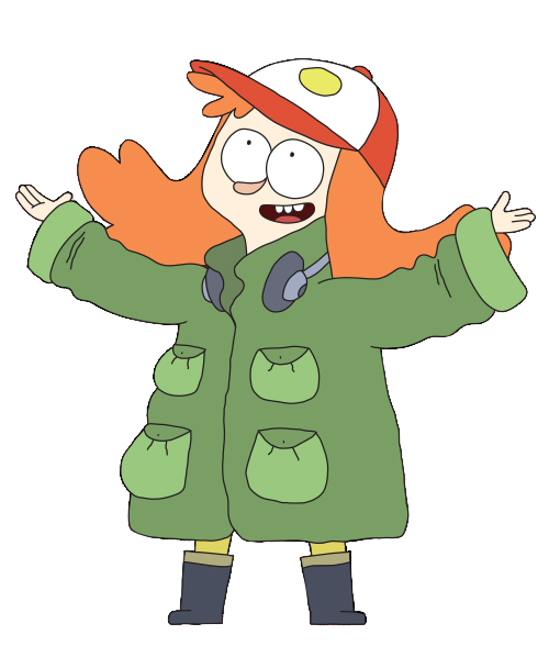 Saraline is a young girl with a somewhat small stature. She has long orange hair pushed behind her head in a widespread coiffure, as well as a red and white cap with a round yellow logo. She typically wears a long olive-green trench coat which drapes over the majority of her legs, along with a set of headphones around her neck (most likely Timbers Tech). She can be seen with the yellow hems of her pants, but occasionally wears her pink and floral "big girl pants" as well.